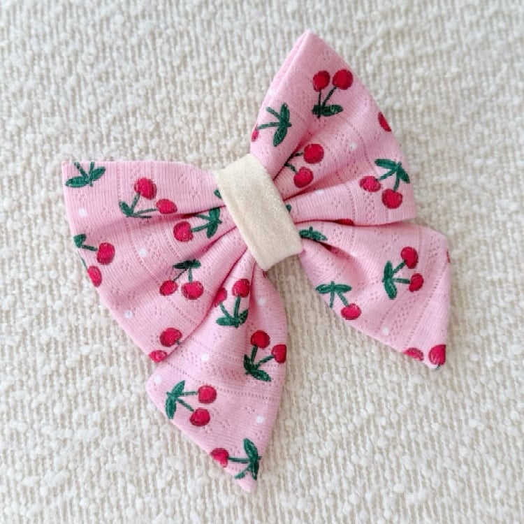 Sweet and playful, this pink fabric salor bow is sprinkled with vibrant cherry prints and delicate white polka dots, finished with a soft cream center.