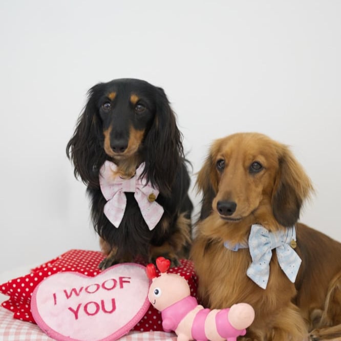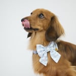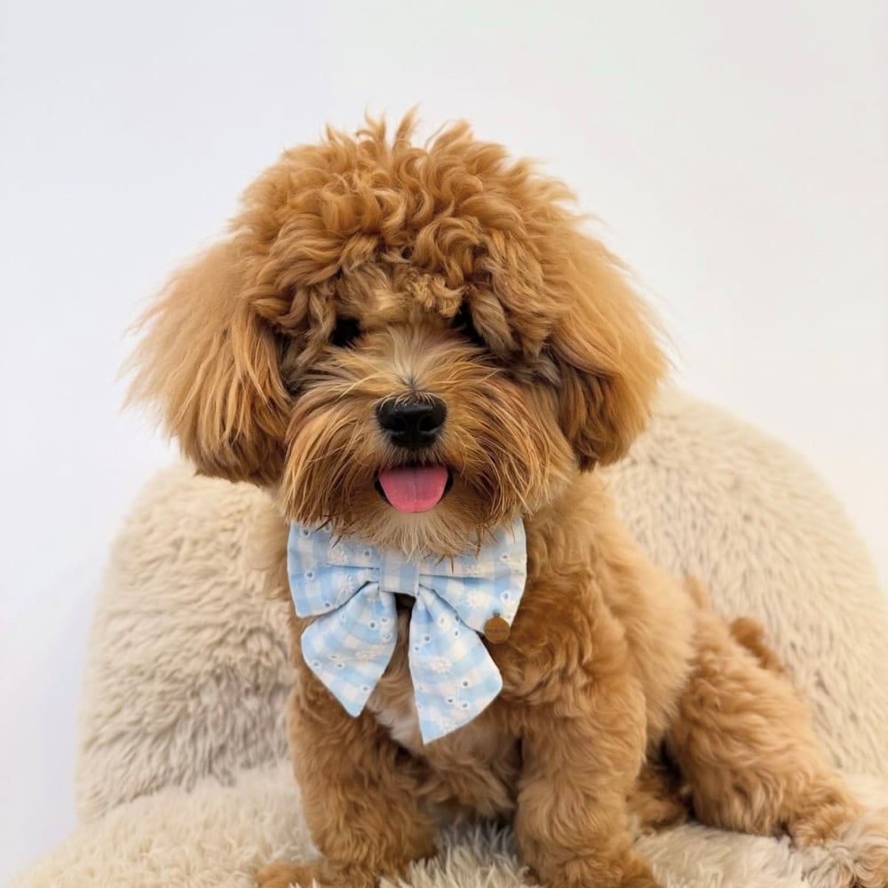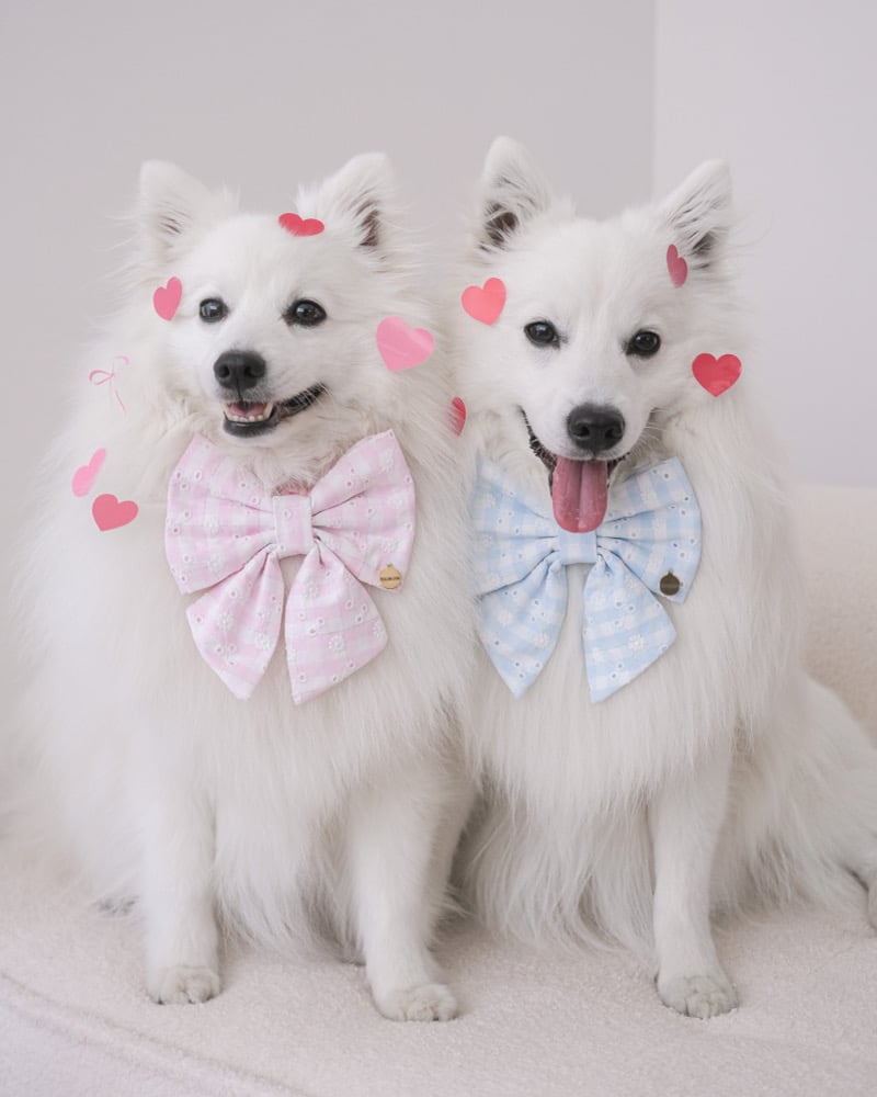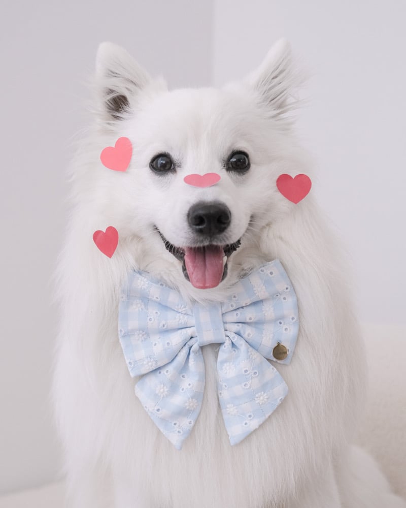 A soft blue eyelet bow with delicate floral details. Classic, romantic, and timeless.