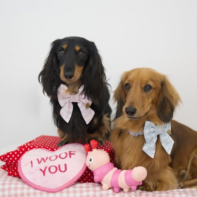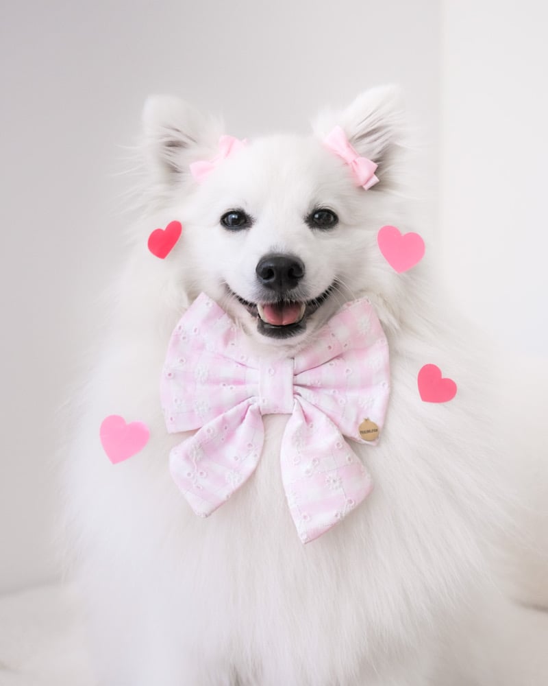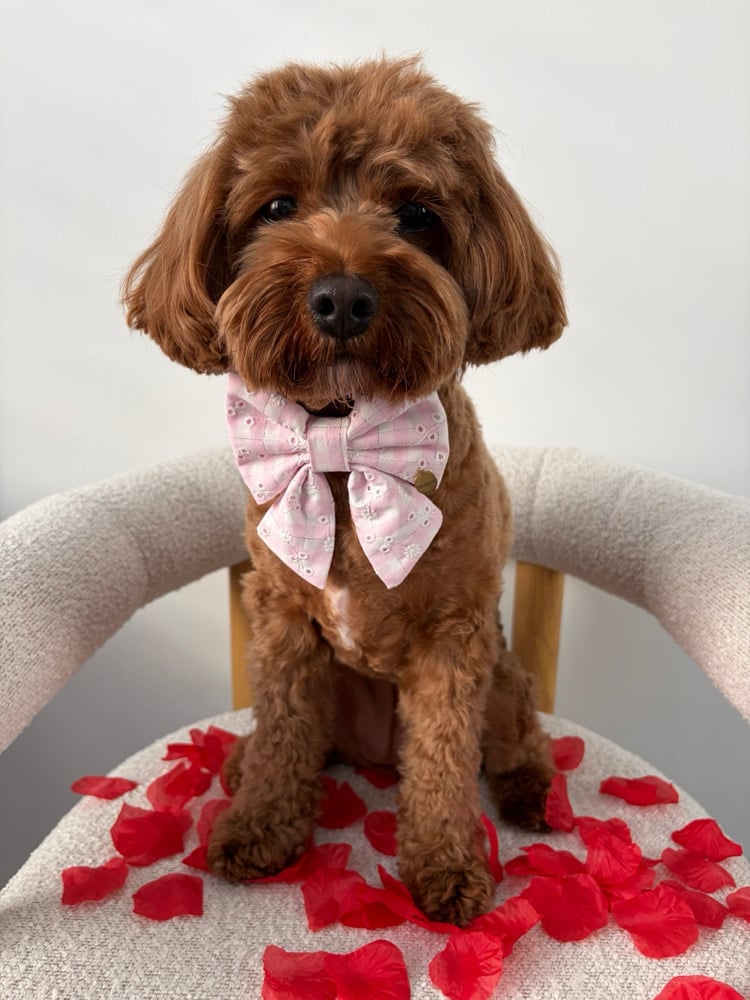A soft pink eyelet bow with delicate floral details. Classic, romantic, and timeless.