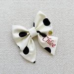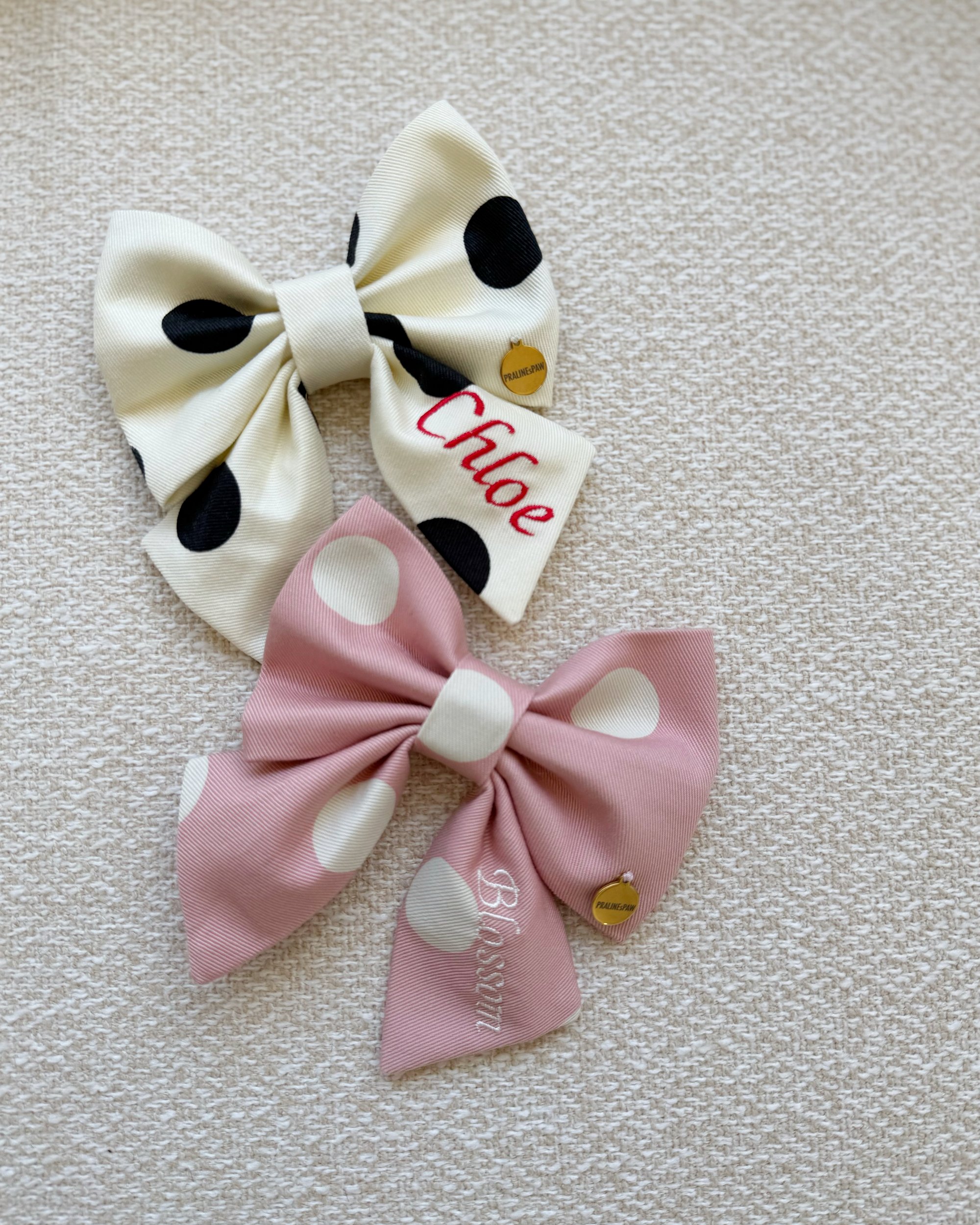 Made from premium cotton fabric with bold polka dot patterns, each bow is finished with your dog’s name beautifully embroidered on the tail for a personalized touch.
