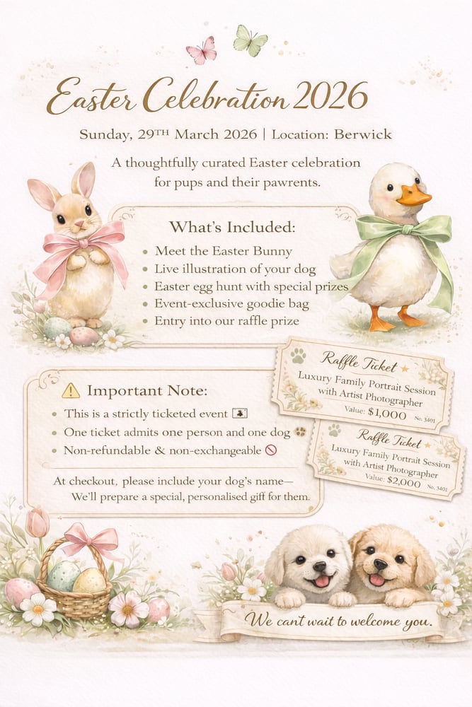 At checkout, please include your dog’s name in the order notes so we can prepare a special personalised gift for them 🤍 You'll receive your digital invitation automatically to your email (please check spam folder) Ambassador code is not valid for this event.