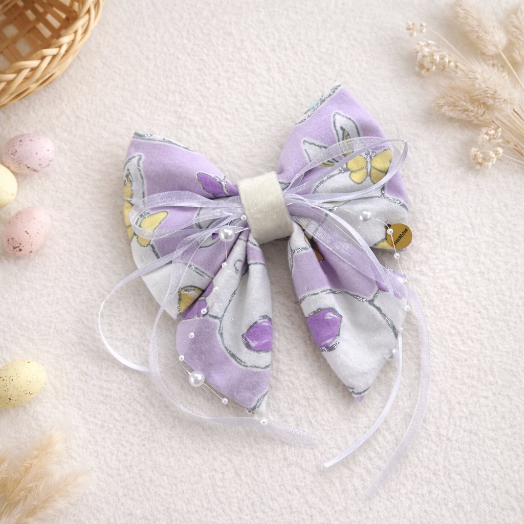 A soft lilac bow featuring bunnies and butterflies, layered with ribbon and pearl accent.π Handmade with mid-weight cotton flannel fabricπ° Available in 2 sizes; XS-S (12cm) & S-M (13cm)π Securely attached elastics
