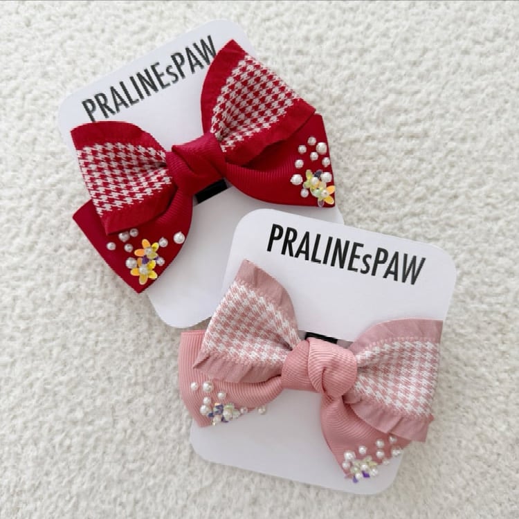A soft ruffle bow featuring a classic houndstooth pattern. The design is enhanced with beading embellishments that add a touch of sparkle and elegance.